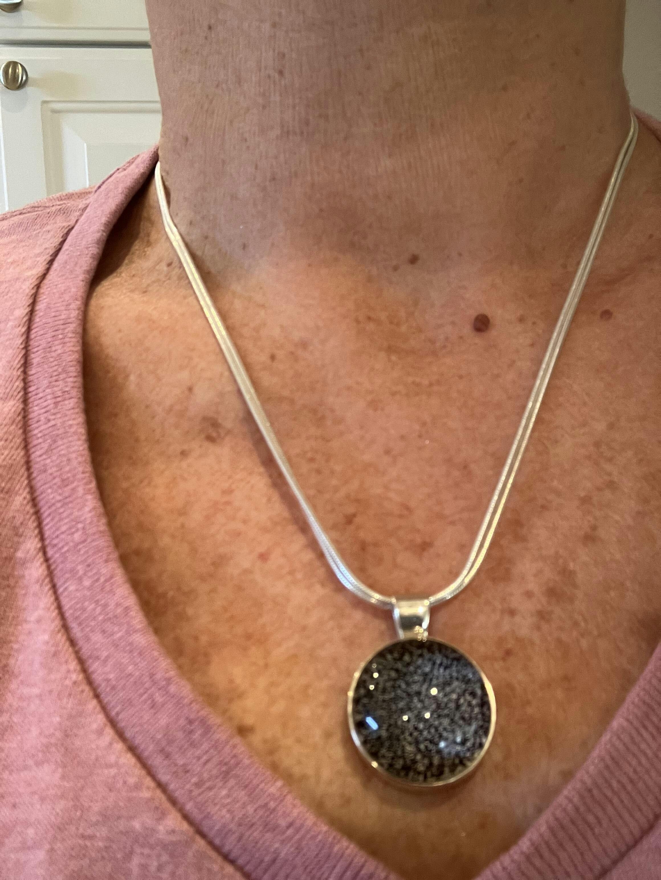 Matthew Olian has great pride in his workmanship! He made me a beautiful black “Forever Pendant” with my husband’s ashes. He got it to me very quickly, knowing how excited I was to finally order it after many months of thinking about it. I loved several of the colors, but I figured the black would be worn with almost anything. I had him include two chains, to insure I would never lose it. I love how the two chains sit together. I got the medium pendant, which is plenty big, and some day I may just get another, maybe a small one in the emerald green or royal orange! Thanks again Matt.